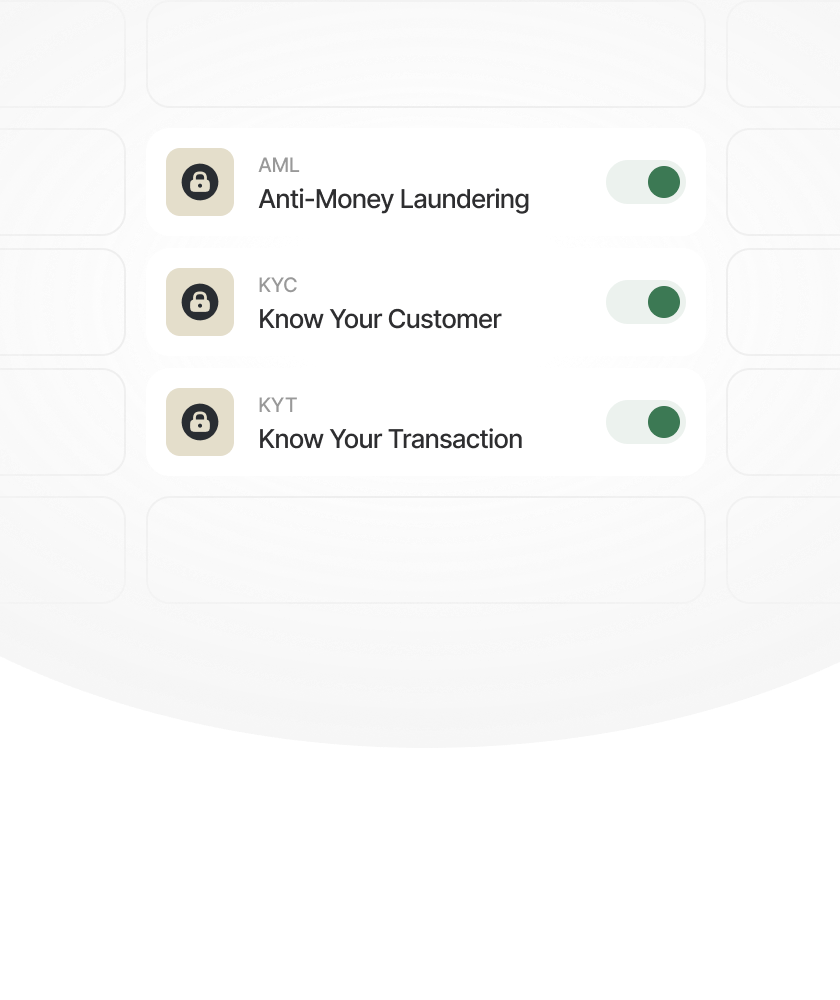 Real-time KYT/AML monitoring to ensure regulatory compliance across jurisdiction - powered by Chainalysis and industry-leading compliance partners